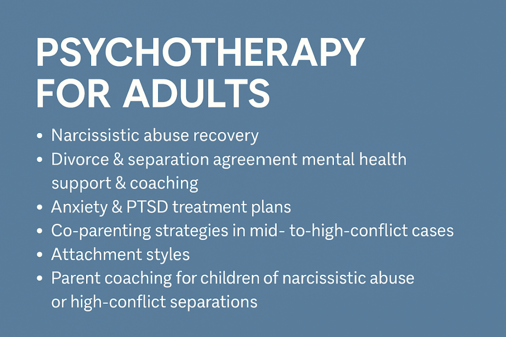 We offer parent coaching designed for caregivers navigating the complex emotional needs of children exposed to narcissistic abuse or high-conflict dynamics. This service focuses on helping parents create safety, emotional attunement, and consistency for their children.