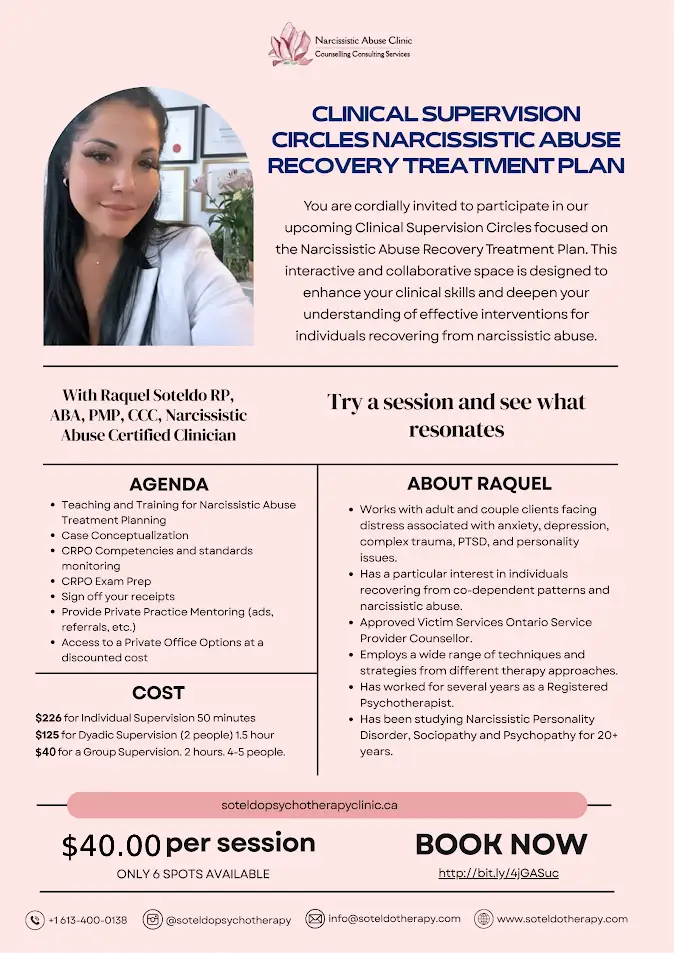 You are cordially invited to participate in our upcoming Clinical Supervision Circles focused on the Narcissistic Abuse Recovery Treatment Plan. This interactive and collaborative space is designed to enhance your clinical skills and deepen your understanding of effective interventions for individuals recovering from narcissistic abuse.